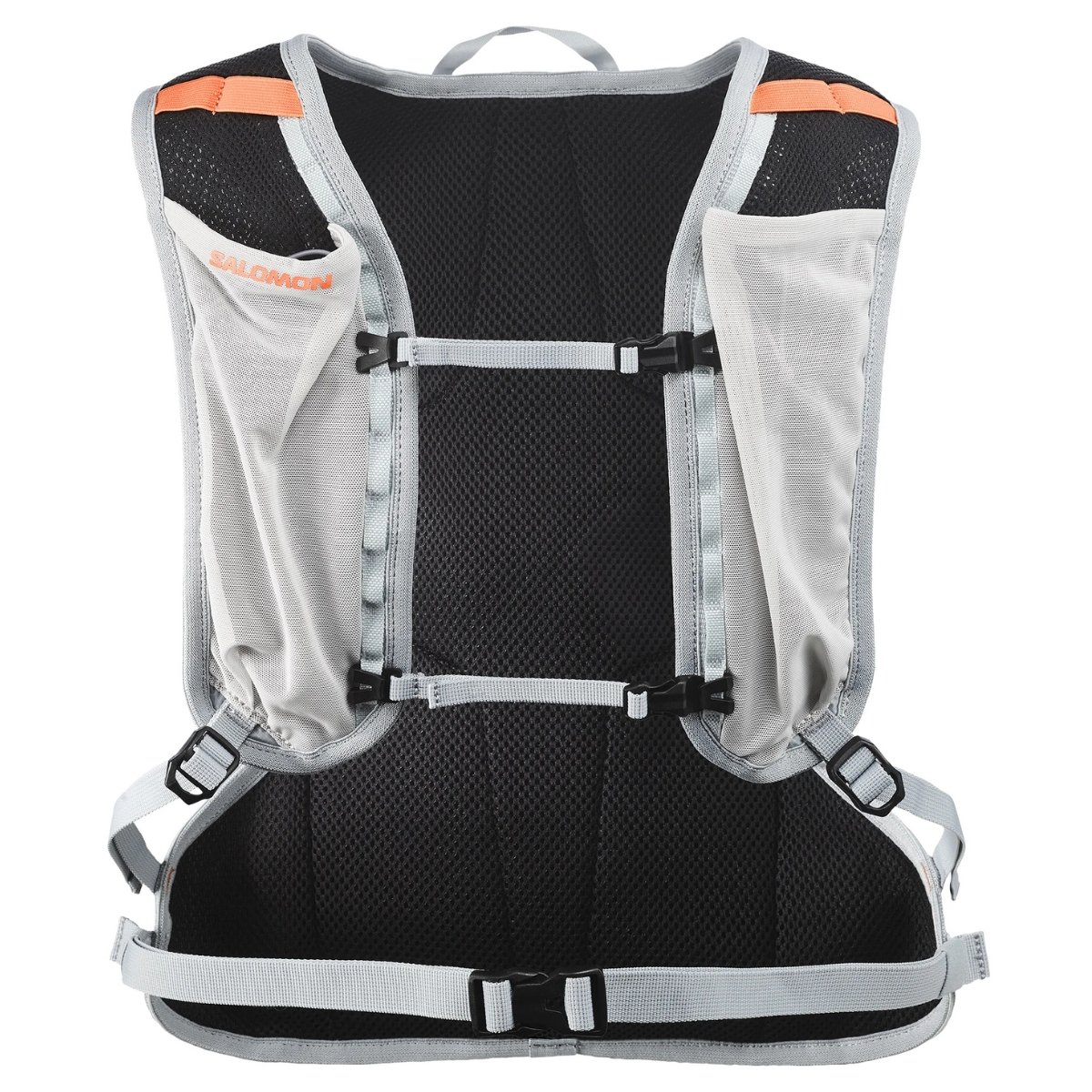 2 přední kapsy na láhve: Tyto přední kapsy určené pro pružné lahve Salomon omezují nárazy. Vrchní elastická poutka zabezpečují lahve, které jsou připravené k použití.